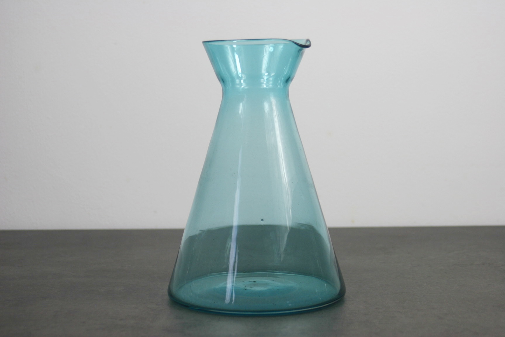 A turquoise blue water carafe, possibly made in Finland. The colour and simple shape make this a striking piece for any dining table or kitchen.